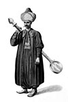 左の写真は、「戦士の服装」の中の巨大なスプーンを持つイェニチェリ(オスマン・トルコ、16世紀?)。このスプーンは食事の際、兵士にスープを配るときに用いられた。